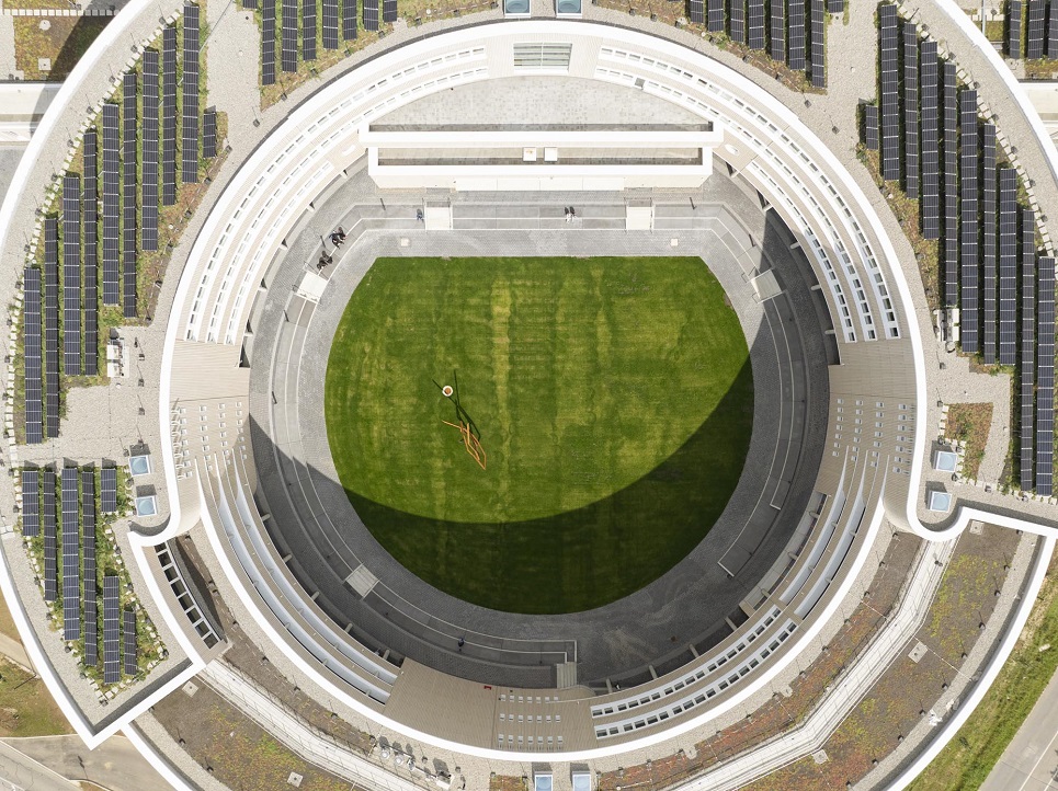 Mit dem Neubau der Bertha-Benz-Schule in Sigmaringen hat der Landkreis Sigmaringen einen modernen Bildungscampus realisiert, der funktionale Klarheit, räumliche Orientierung und Nachhaltigkeit in einem prägnanten architektonischen Konzept vereint. Der Entwurf des Architekturbüro LRO GmbH & Co. KG aus Stuttgart folgt einer klaren geometrischen Ordnung. Ein kreisförmiger Baukörper bildet das kommunikative Zentrum der Schule, ergänzt durch einen linearen Gebäuderiegel für Fachräume und Werkstätten. Die Architektur schafft damit nicht nur eine eindeutige räumliche Identität, sondern auch flexible Strukturen für unterschiedliche Nutzungsanforderungen und pädagogische Konzepte. Die Dachflächen sind dabei von Beginn an als aktive Gestaltungselemente gedacht. Sie ergänzen die kompakte Bauform funktional und tragen wesentlich zur ökologischen und energetischen Gesamtstrategie des Projekts bei. Die Kombination aus Dachbegrünung und Photovoltaik ist dabei ein integraler Bestandteil der architektonischen und technischen Planung.