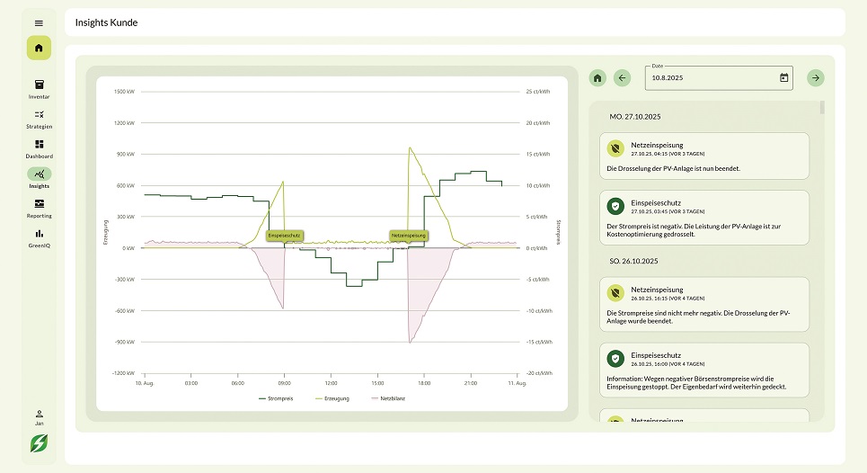 Die KI-basierte Software Greencore AI von Greenflash analysiert dauerhaft Marktpreise, Erzeugungsleistung und Verbrauchsprognosen. Sinkt der Börsenpreis unter null, wird das Energiesystem abgeriegelt.